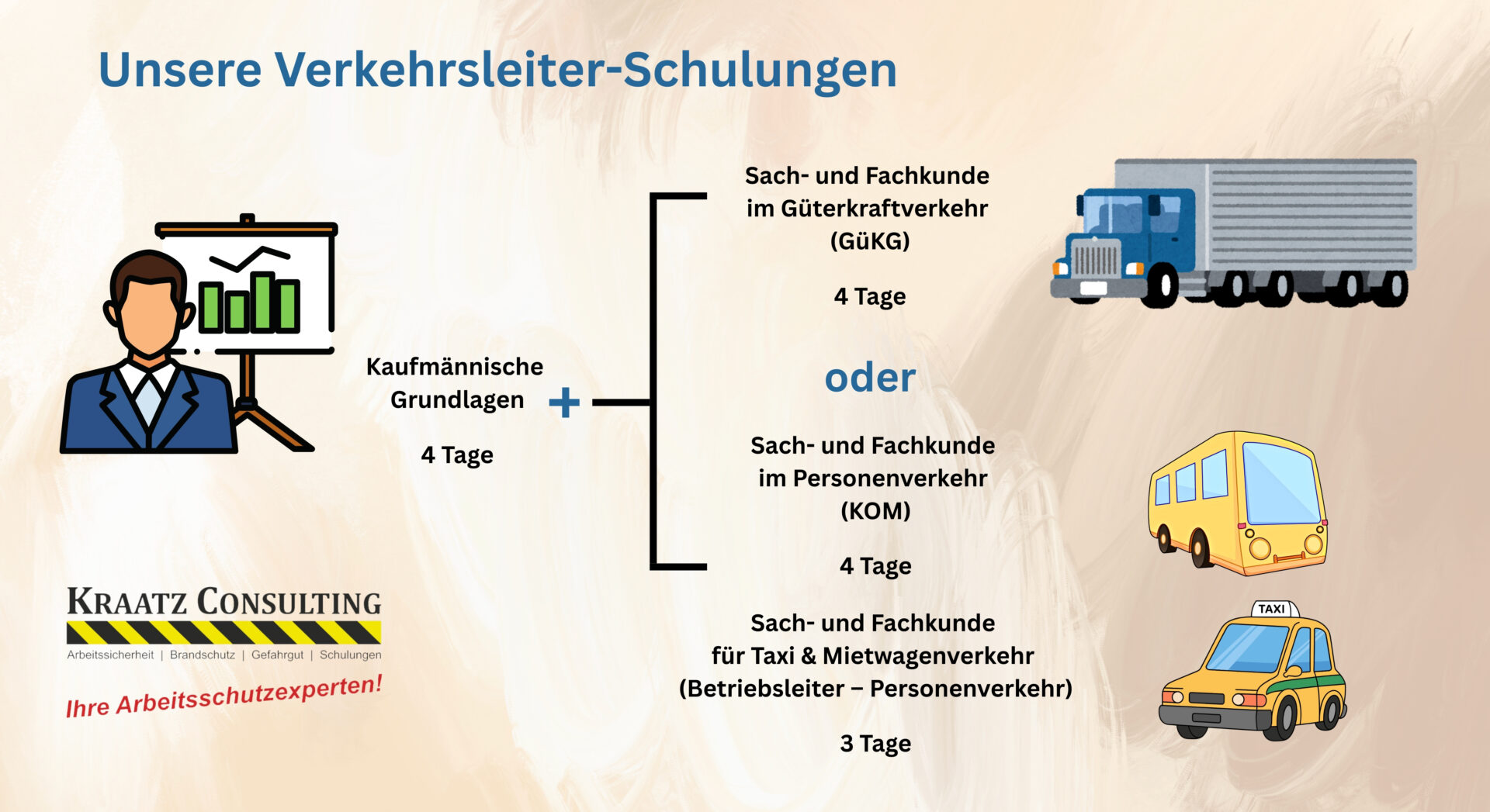 Der fachliche Teil ist je nach Fachrichtung für den Bereich Sach- und Fachkunde im Güterkraftverkehr (Verkehrsleiter – GüKG) mit 4 Tagen und der Kurs Sach- und Fachkunde im Personenverkehr (Verkehrsleiter – KOM) / Omnibus mit 4 Tagen angesetzt.